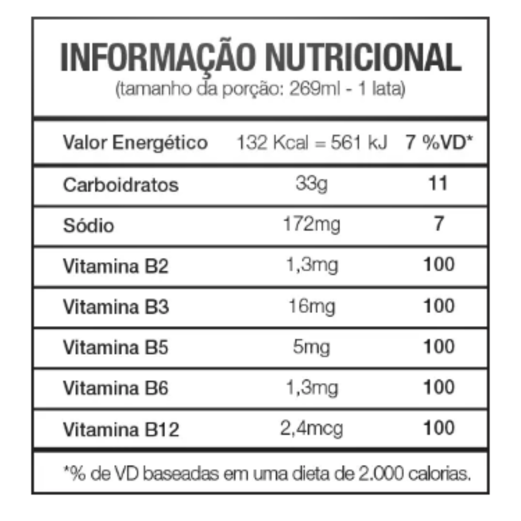 Água Gaseificada, Açúcar, Extrato de Acerola (Malpighia Glabra), Extrato de Cranberry (Vaccinium Macrocarpon), Extrato de Açaí (Euterpe oleracea), Extrato de Guaraná (Paullinia Cupana), Taurina (1076 mg/269 ml), Glucoronolactona (645,6 mg/269 ml), Cafeína (86 mg/269 ml), Inositol (54 mg/ 269 ml), Niacinamida (Vitamina B3), Pantotenato de Cálcio (Vitamina B5), Riboflavina (Vitamina B2), Hidroclorato de Piridoxina (Vitamina B6), Cianocobalamina (Vitamina B12), Acidulante Ácido Cítrico (INS330), Regulador de Acidez (INS331iii), Corante Caramelo IV (INS 150d), Aroma Natural de Guaraná, e Conservador Benzoato de Sódio (INS211). Mistura de extratos de frutas exclusiva da Forever: Acerola, Cranberry, Açaí e Guaraná.